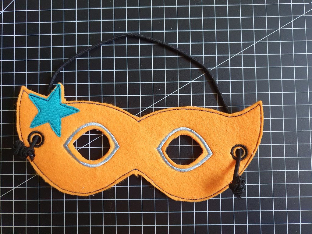 Für meine Maske habe ich zwar nicht den klassischen Superhelden-Filz verwendet, aber da Halloween vor der Tür stand, fand ich ein kräftiges Orange absolut passend. Die ITH-Technik ist wirklich genial: Nach dem Sticken müssen nur noch an den markierten Stellen kleine Löcher geschnitten werden, anschließend noch ein Gummiband durchziehen – und schon ist die Superheldenmaske einsatzbereit.