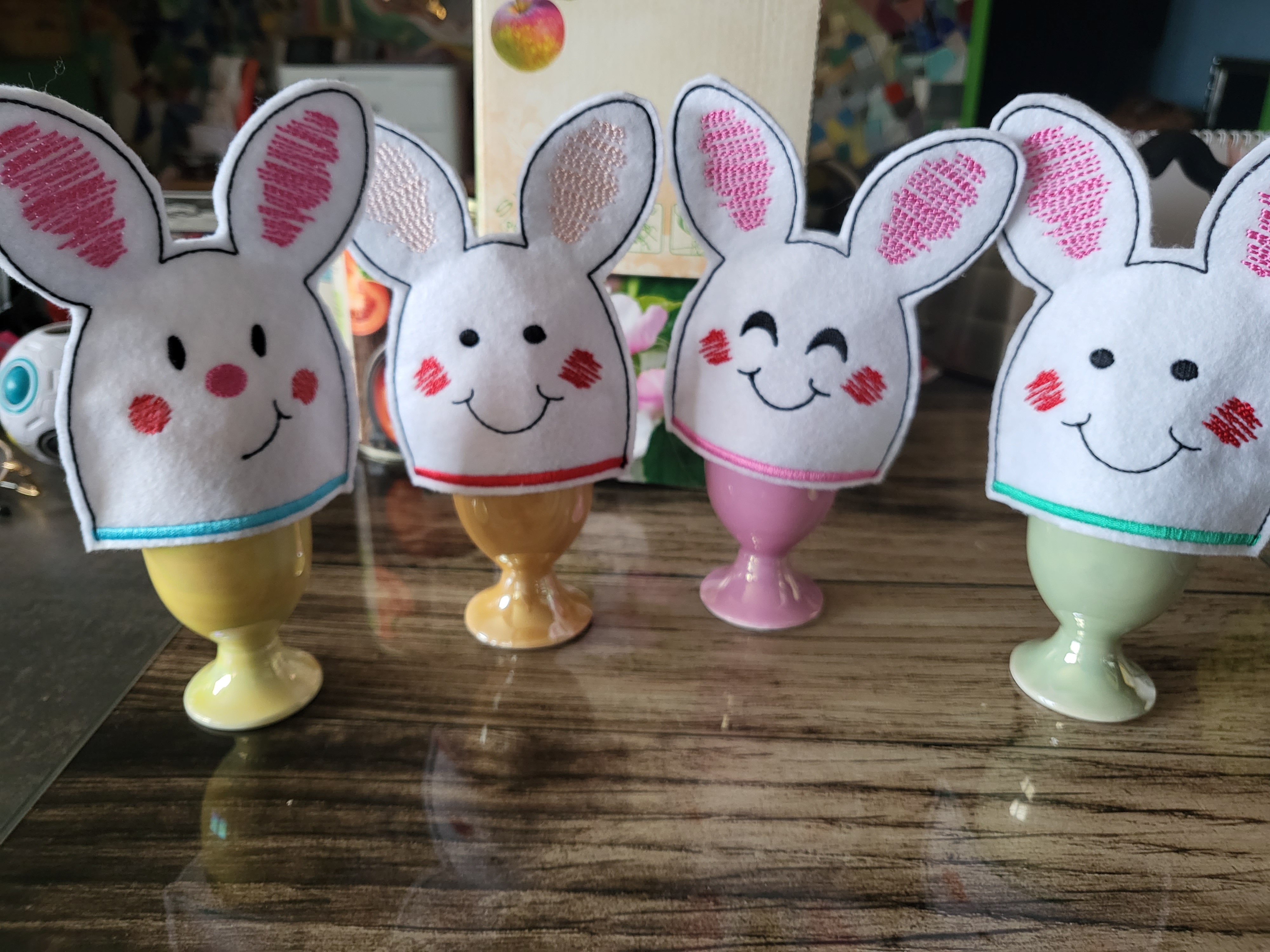 Passend zu den Anhängern und Steckern habe ich dann übrigens auch noch Eierwärmer mit Hasenmotiv gestickt. Die Stickdatei dafür war diesmal von „Stoffelch“ (ebenfalls über Etsy gekauft). So ist mein Ostertisch jetzt nicht nur bunt geschmückt, sondern die Frühstückseier bleiben auch noch schön warm – und alles im fröhlichen Hasenlook!