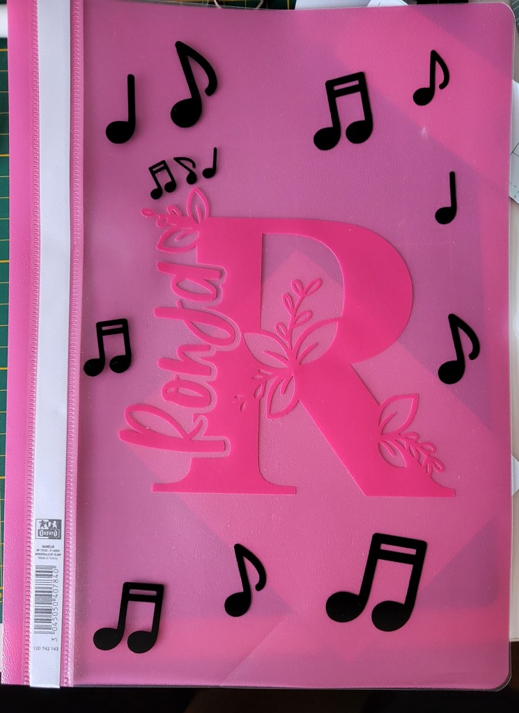 Aus dem Circut Design Space habe ich ein schickes „R“ genommen, den Namen meiner Tochter kunstvoll eingefügt und das Ganze mit einigen Noten verziert. Das Ergebnis hat nicht nur meiner Maus gefallen , sondern auch mich selbst begeistert – ein echter Hingucker im Klassenzimmer!